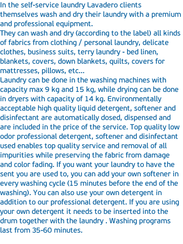O nama Home Price list Instructions Location Working hours: Mon - Sun: 8 - 23 h  contact phone  in case  of failure or  information: +385 98 9893843  e-mail: praonicarublja@lavadero.hr SELF-SERVICE LAUNDRY LAUNDRY SERVICE Working hours: Mon - Fri:	8 - 18 h Sat:        	8 - 13 h  contact phone: +385 1 4819 368 +385 98 9893843  e-mail: praonicarublja@lavadero.hr